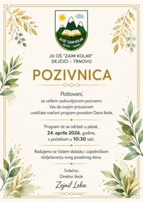 OŠ ”Zaim Kolar” proslavlja Dan škole 24. aprila, te će se svečani program obilježavanja ove godine održati u petak, 24.04.2026. godine, u školi u Dejčićima, sa početkom u 10:30 sati.